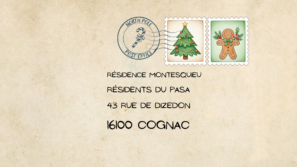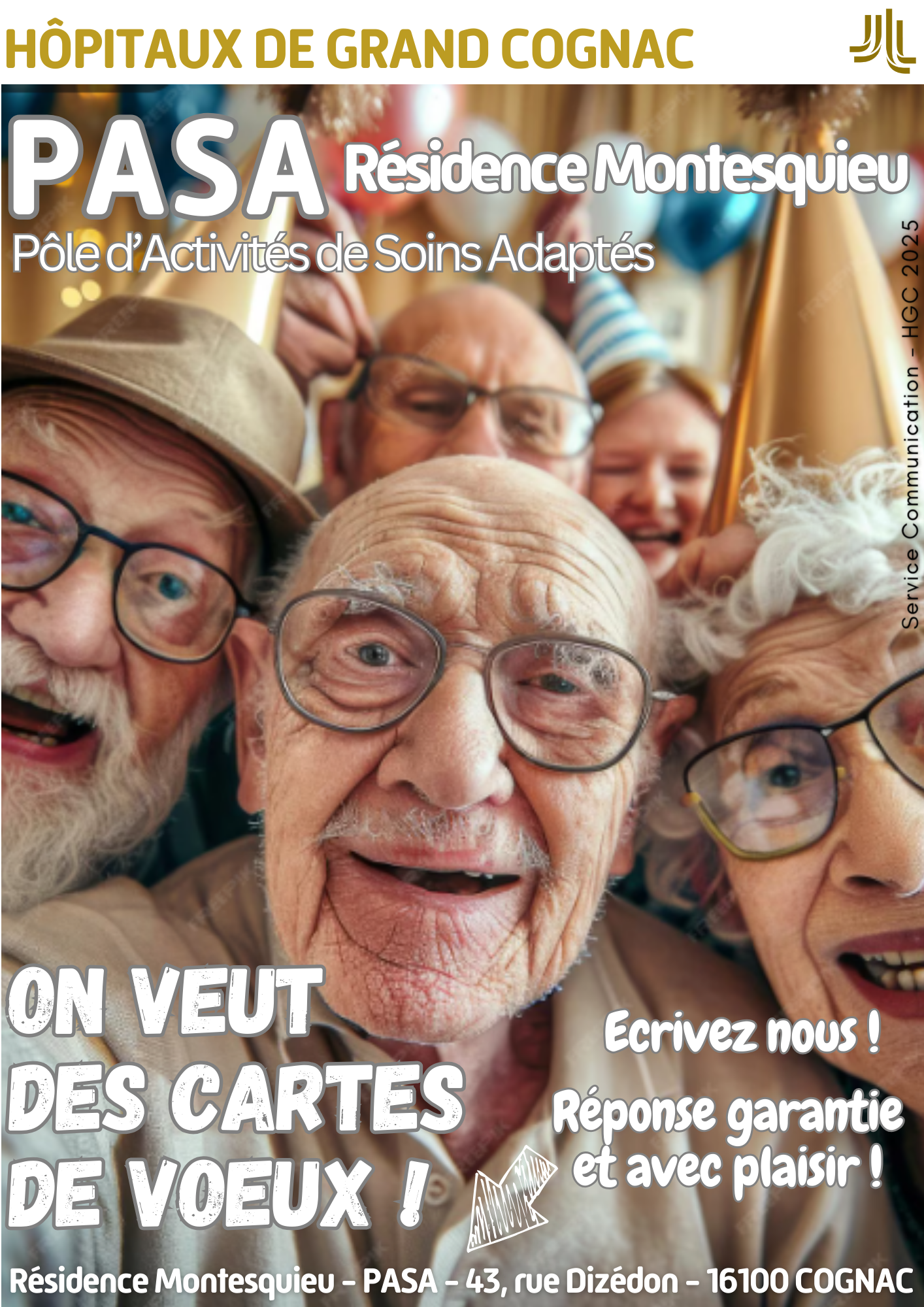 Le P.A.S.A. (Pôle d’Activités et de Soins Adaptés) de la Résidence Montesquieu des Hôpitaux de Grand Cognac lance un appel aux cartes de vœux pour donner un peu de couleur et de chaleur dans la boîte aux lettres de ses résidents. Participez, C’est facile !