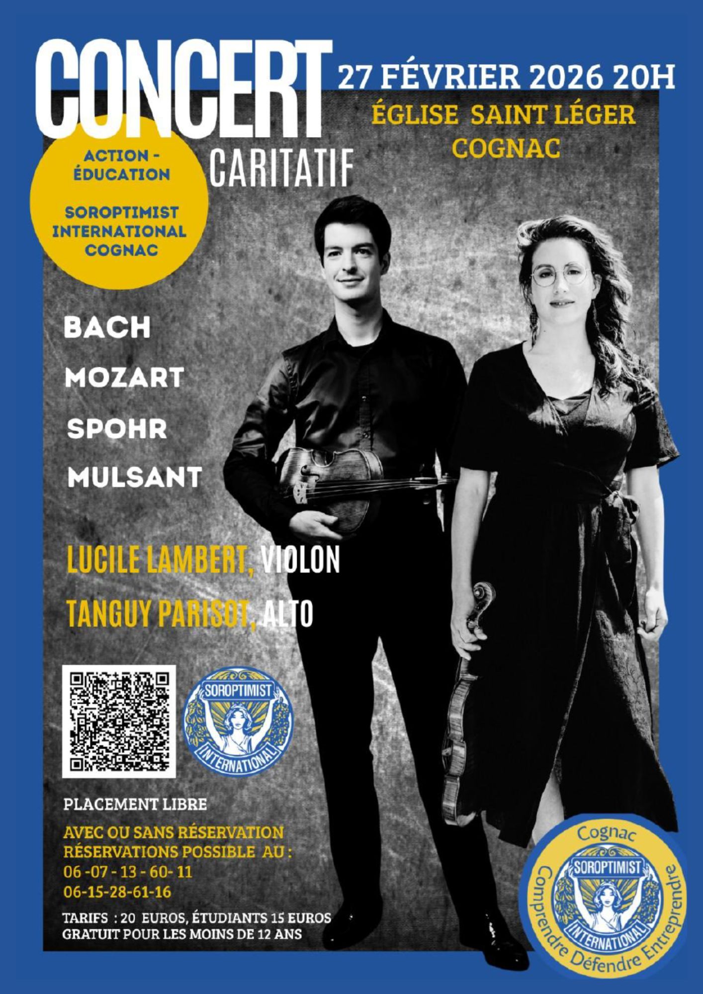 Le bénéficie du concert sera attribué à une jeune fille ou femme de Cognac ou Grand Cognac dans le cadre de la musique.